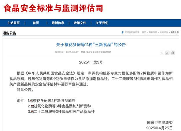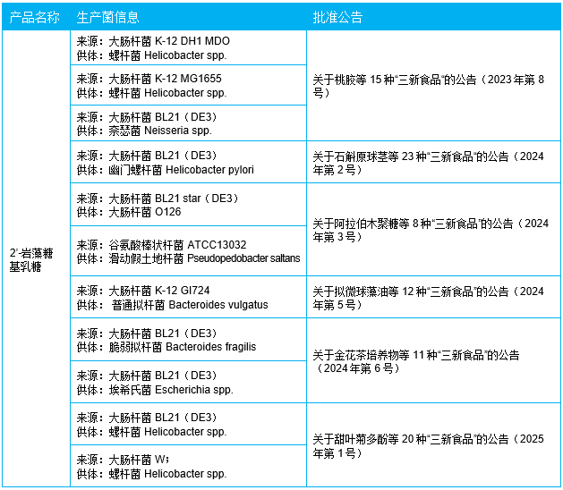 2025年5月7日,國(guó)家衛(wèi)生健康委發(fā)布公告,批準(zhǔn)櫻花多酚等11種“三新食品”的使用規(guī)范。其中,2'-巖藻糖基乳糖(2'-FL)的應(yīng)用范圍進(jìn)一步擴(kuò)展,新增適用于嬰幼兒谷類輔助食品(13.02.01)和嬰幼兒罐裝輔助食品(13.02.02);乳糖-N-新四糖(LNnT)增補(bǔ)了新型生產(chǎn)菌來(lái)源。此舉標(biāo)志著我國(guó)HMOs在嬰幼兒食品領(lǐng)域的應(yīng)用與國(guó)際接軌,美國(guó)、歐盟、澳新等地區(qū)此前已批準(zhǔn)同類應(yīng)用。
