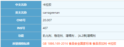 卡拉膠是常見(jiàn)的食品添加劑,GB 2760-2014《食品安全國(guó)家標(biāo)準(zhǔn) 食品添加劑使用標(biāo)準(zhǔn)》中描述其主要功能作用為:乳化劑、穩(wěn)定劑、增稠劑。可在冷凍飲品中“按產(chǎn)品所需適量使用”的規(guī)定。